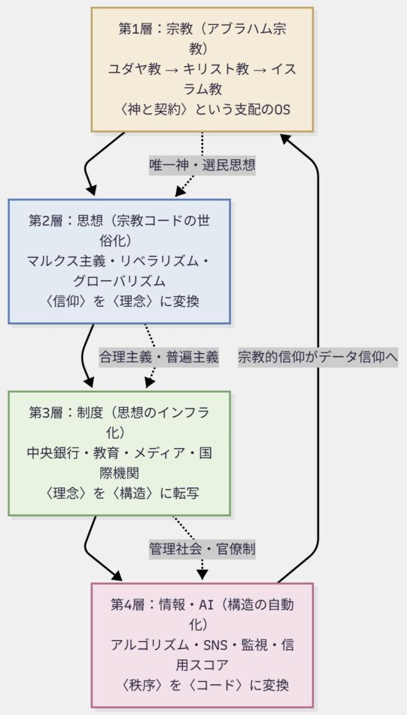 宗教→思想→制度という三層が連動することで、